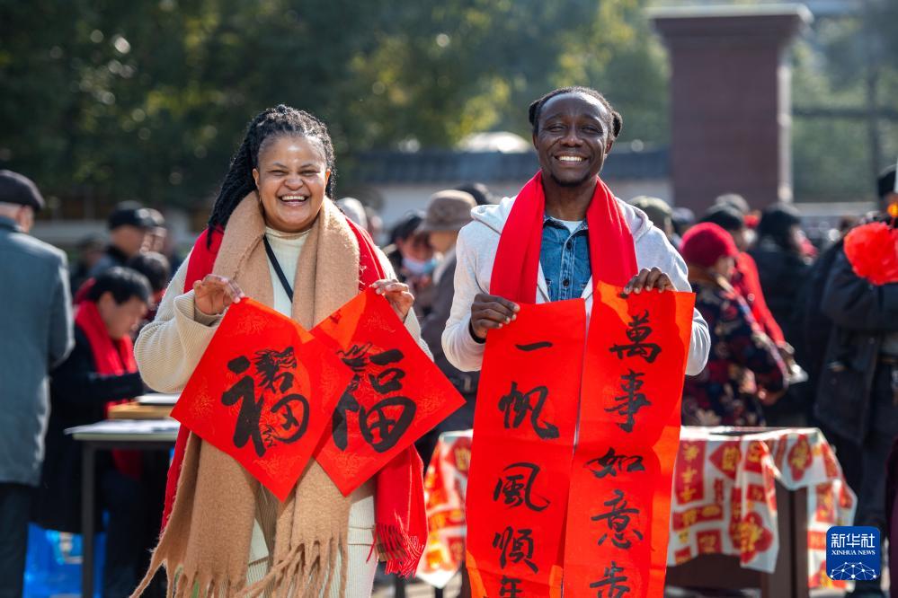1月11日,在浙江省湖州市长兴县雉城街道高家墩居民区,外国友人展示领取的新年春联和福字。(新华社发 谭云俸 摄)