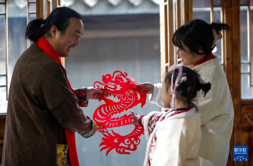 1月11日,在江苏省兴化市昭阳街道北门街区,民间艺人(左)向社区居民介绍“龙”形剪纸作品。(新华社发 周社根 摄)