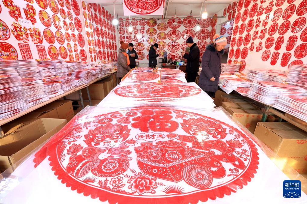 1月11日,在河北省石家庄市长安区义堂年货批发市场,顾客挑选剪纸福字。(新华社发 梁子栋 摄)