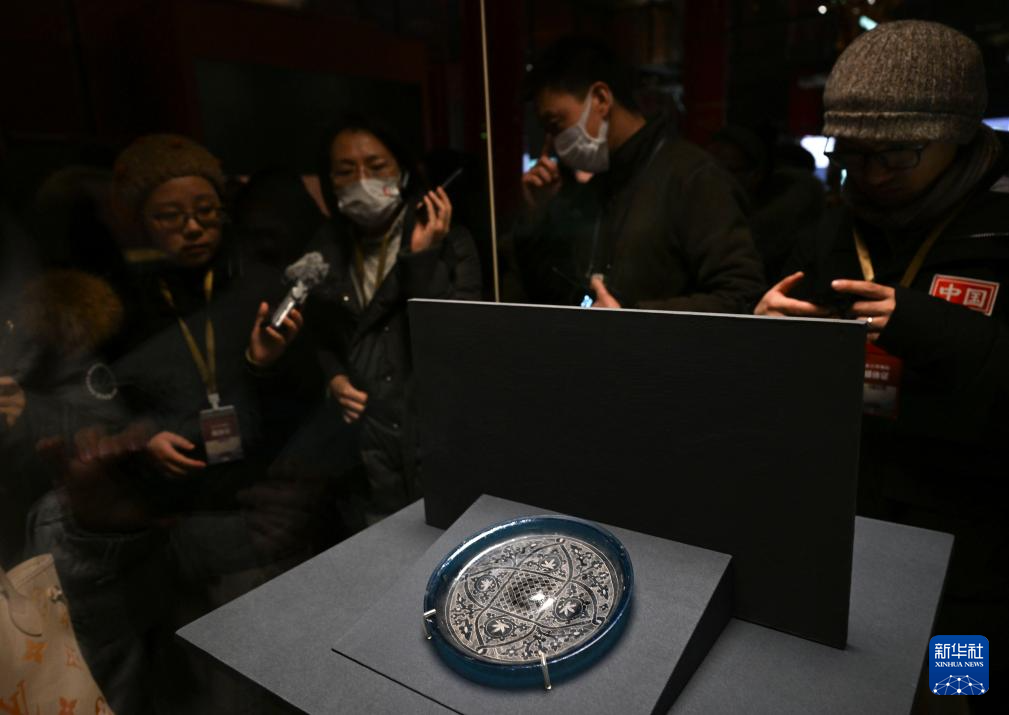 这是展出的陕西法门寺地宫出土唐代刻花蓝色玻璃盘(1月10日摄)。(新华社记者 金良快 摄)