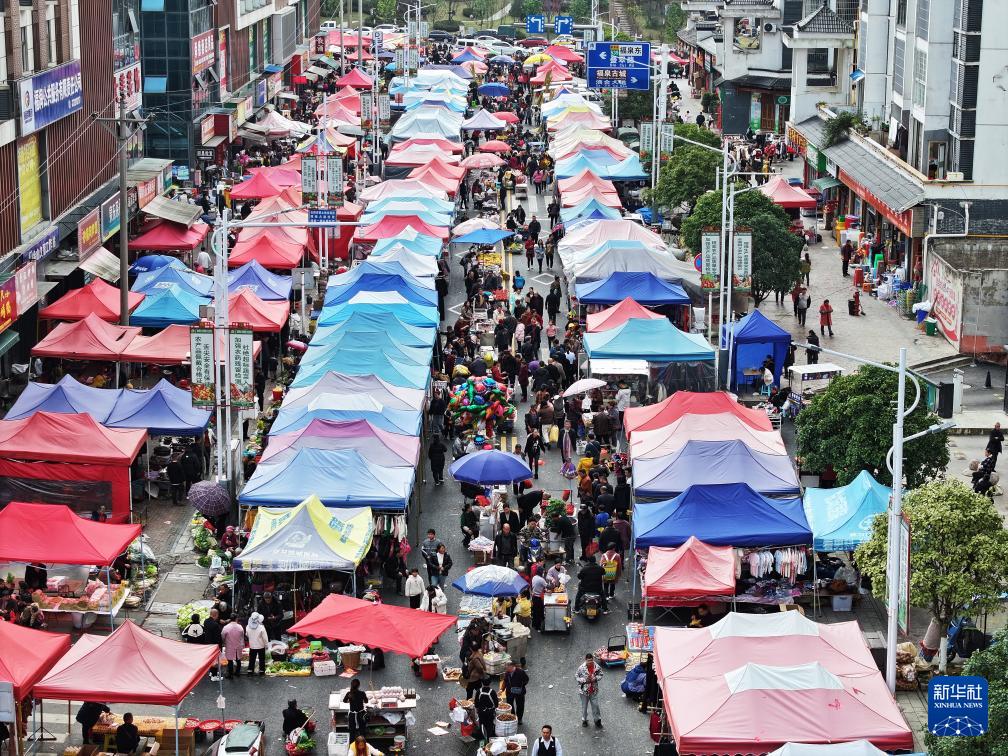 1月14日,人们在贵州省黔南布依族苗族自治州福泉市金山街道办事处赶集(无人机照片)。(新华社发 黄欢 摄)