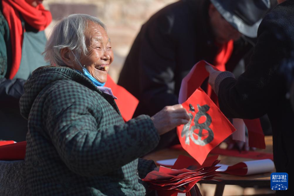 1月14日,在河北省石家庄市井陉县东尖山村,村中老人拿着书法爱好者送来的新春福字。(新华社发 张晓峰 摄)