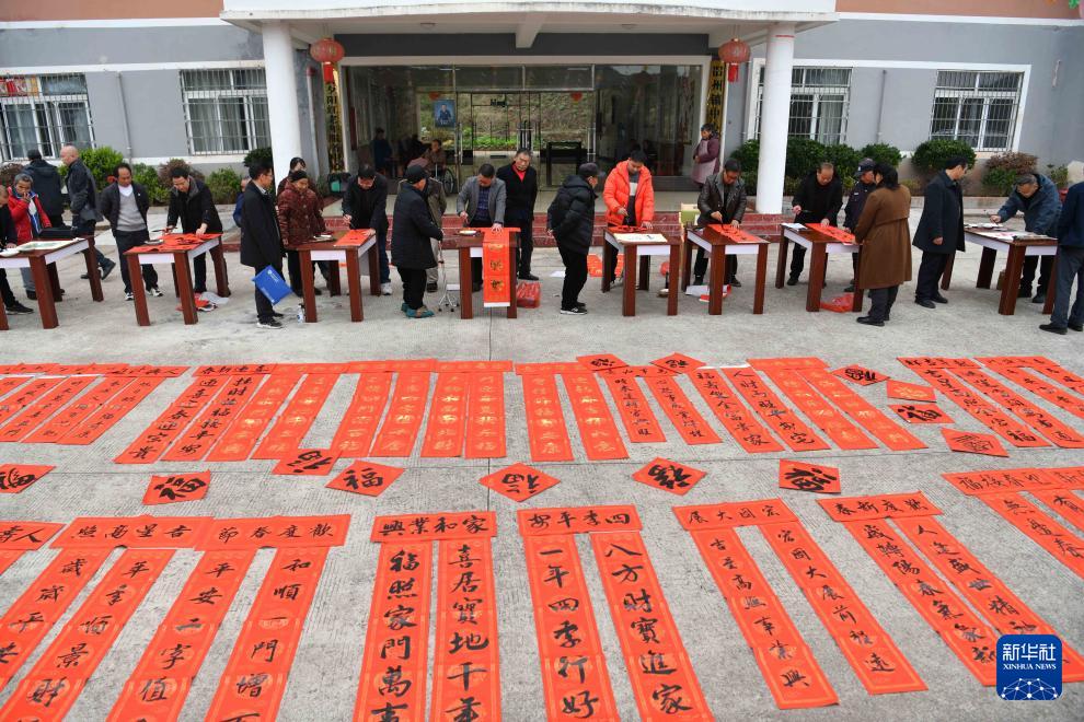1月14日,书法爱好者在贵州省黔东南苗族侗族自治州黄平县旧州镇冷水河社区为群众书写春联。(新华社发 梁文 摄)