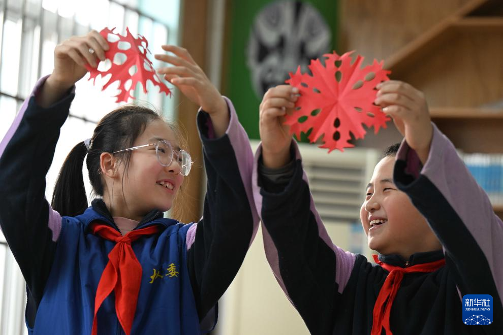 1月15日,河北省石家庄市裕华西路小学的学生在校园庙会活动中展示自己剪的窗花。(新华社发 陈其保 摄)