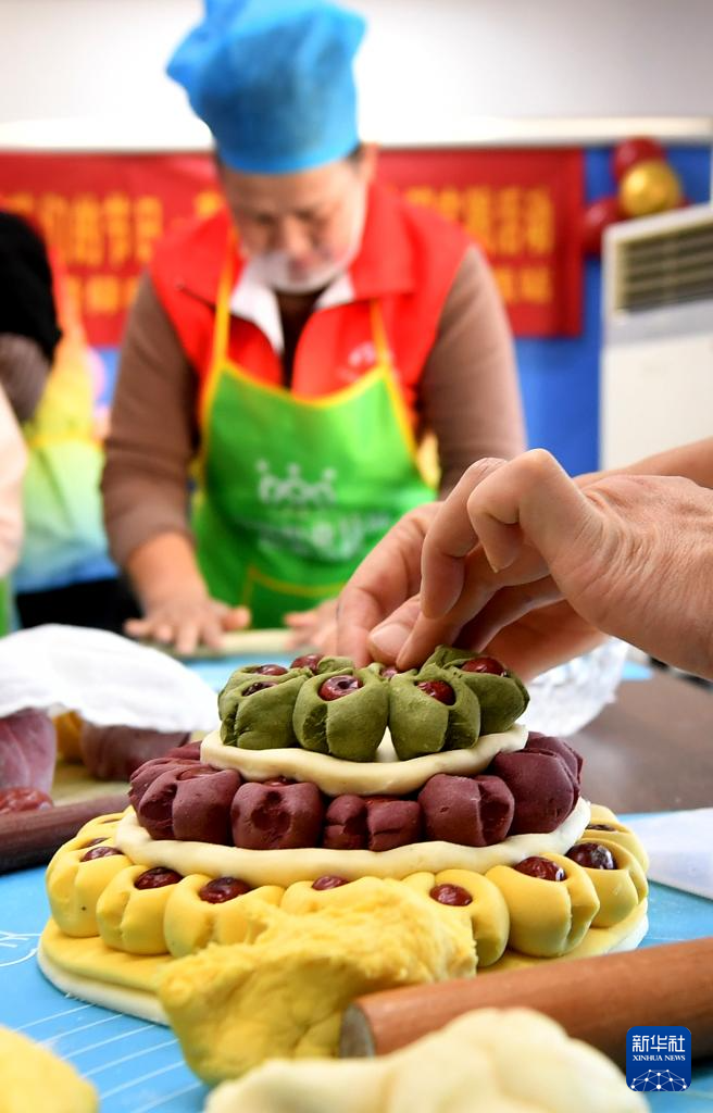1月15日,在山东省青岛市市南区湛山街道仰口路社区,居民在制作枣饽饽。(新华社发 王海滨 摄)
