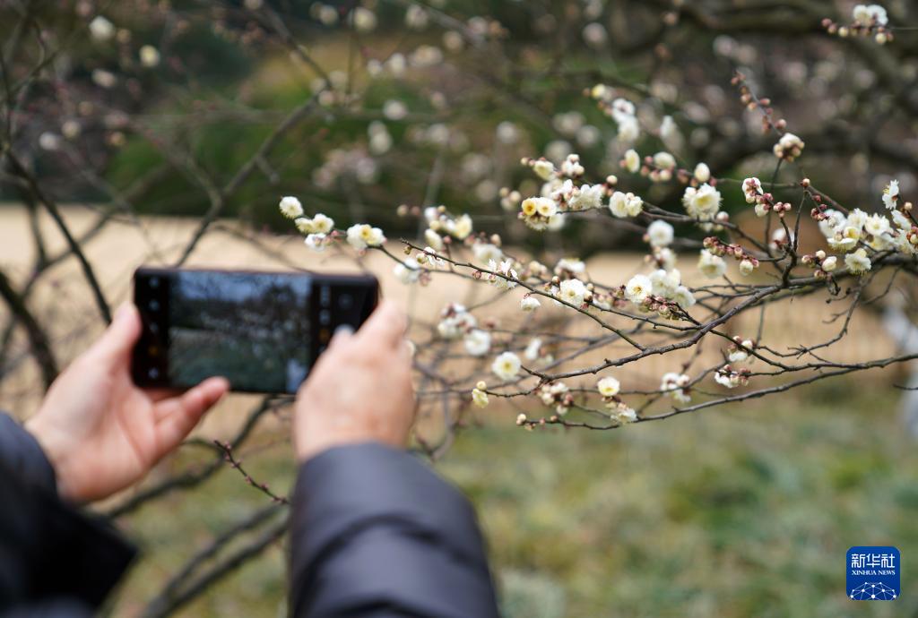 1月18日,游客在杭州西湖孤山梅园拍照。(新华社记者 韩传号 摄)