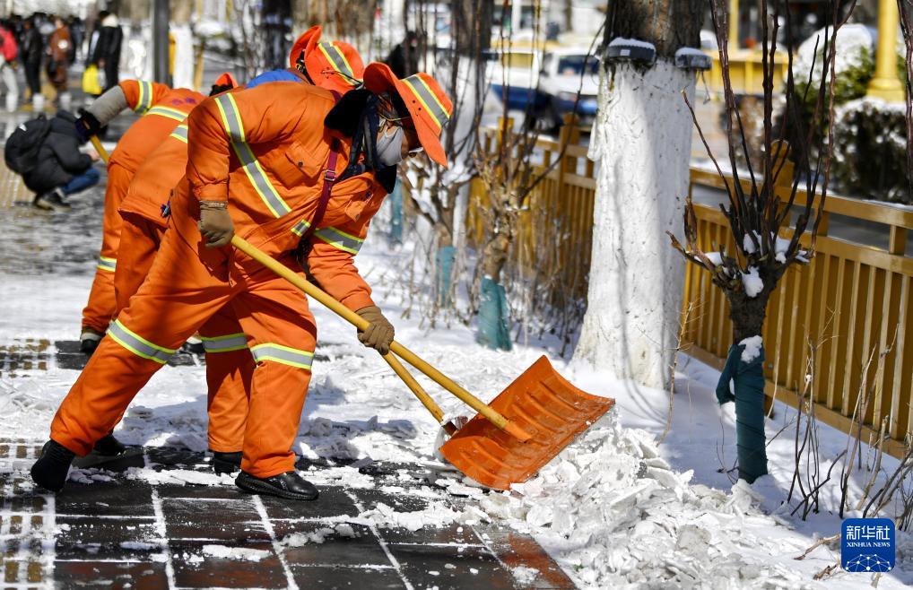 1月18日,环卫工人在清理拉萨街道上的积雪。(新华社记者 张汝锋 摄)