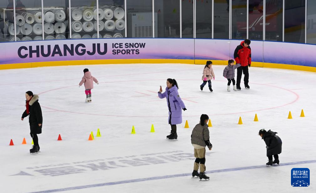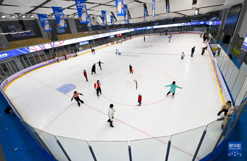 游客在“创聚冰雪”陕西国际体育之窗国际标准真冰场滑冰(1月21日摄)。(新华社记者 邹竞一 摄)