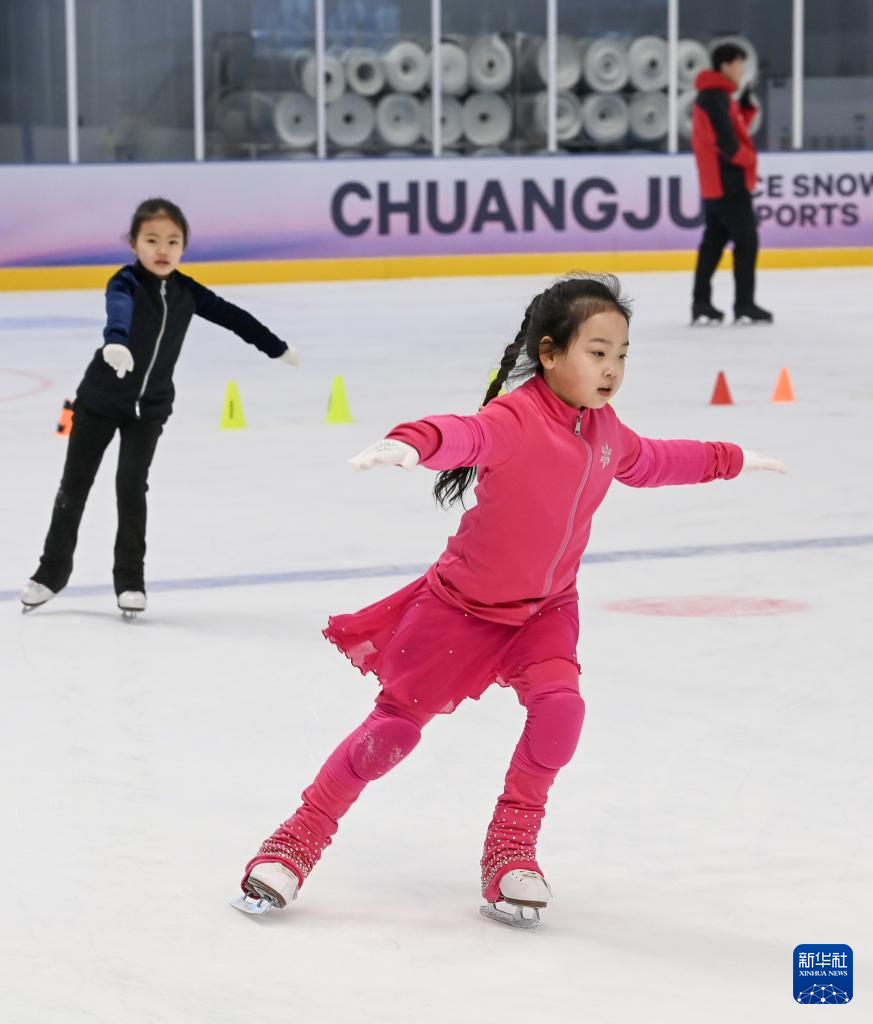 小朋友在“创聚冰雪”陕西国际体育之窗国际标准真冰场滑冰(1月21日摄)。(新华社记者 邹竞一 摄)
