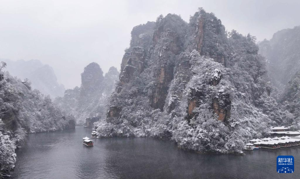 1月22日,游人乘船在张家界市武陵源宝峰湖景区赏雪游玩(无人机照片)。(新华社发 吴勇兵 摄)