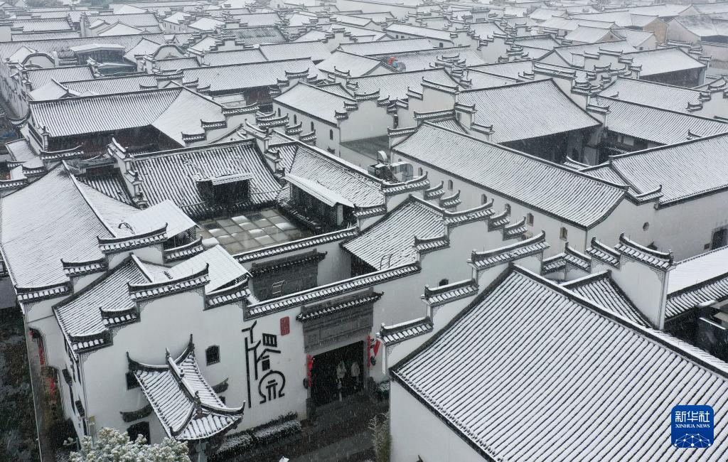 1月22日拍摄的浙江省东阳市卢宅景区雪景(无人机照片)。(新华社发 包康轩 摄)