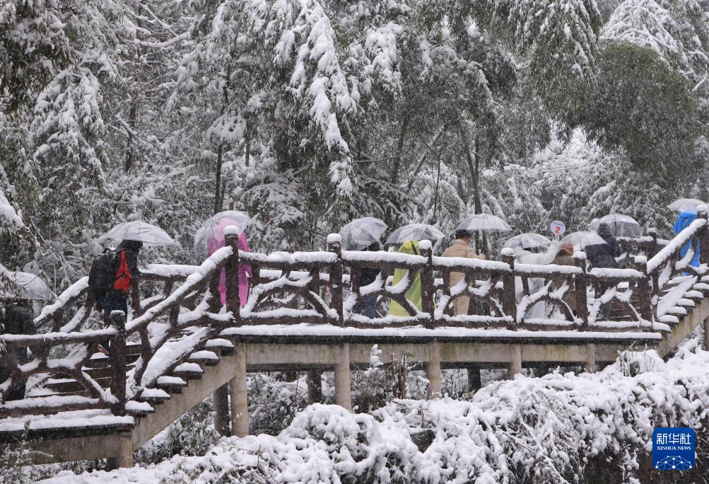 1月22日,游人在张家界市武陵源宝峰湖景区赏雪游玩。(新华社发 吴勇兵 摄)