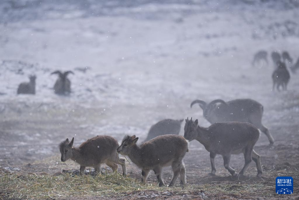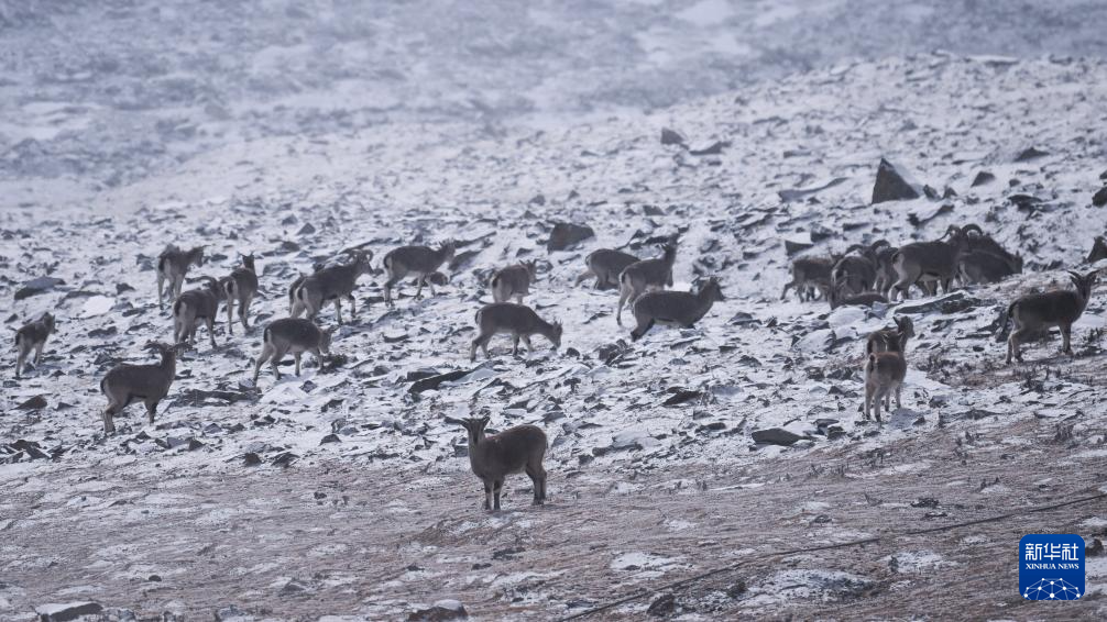 1月23日,几只岩羊在青海省海北藏族自治州门源回族自治县境内的岗什卡雪峰活动。(新华社记者 张龙 摄)