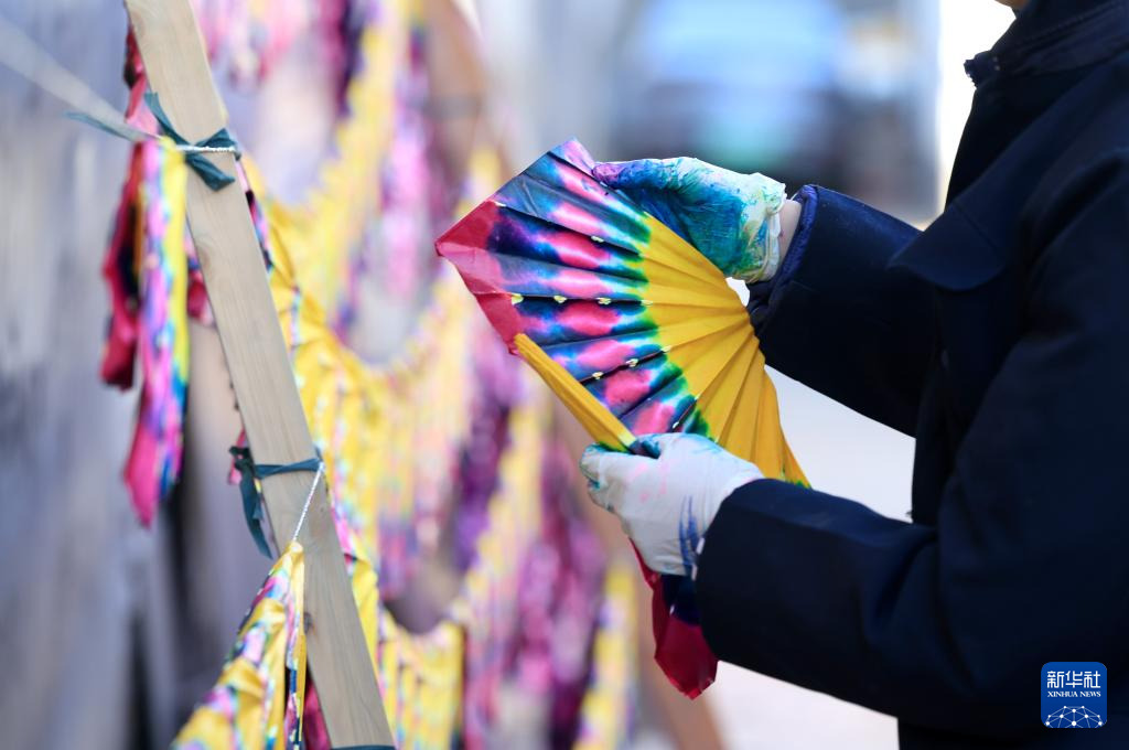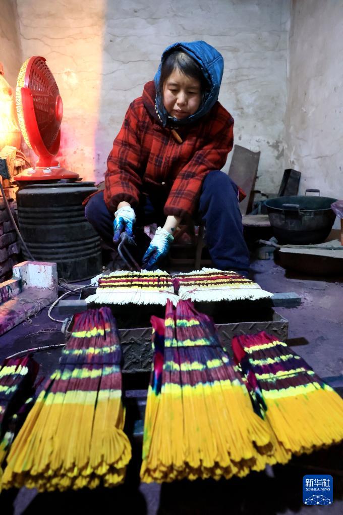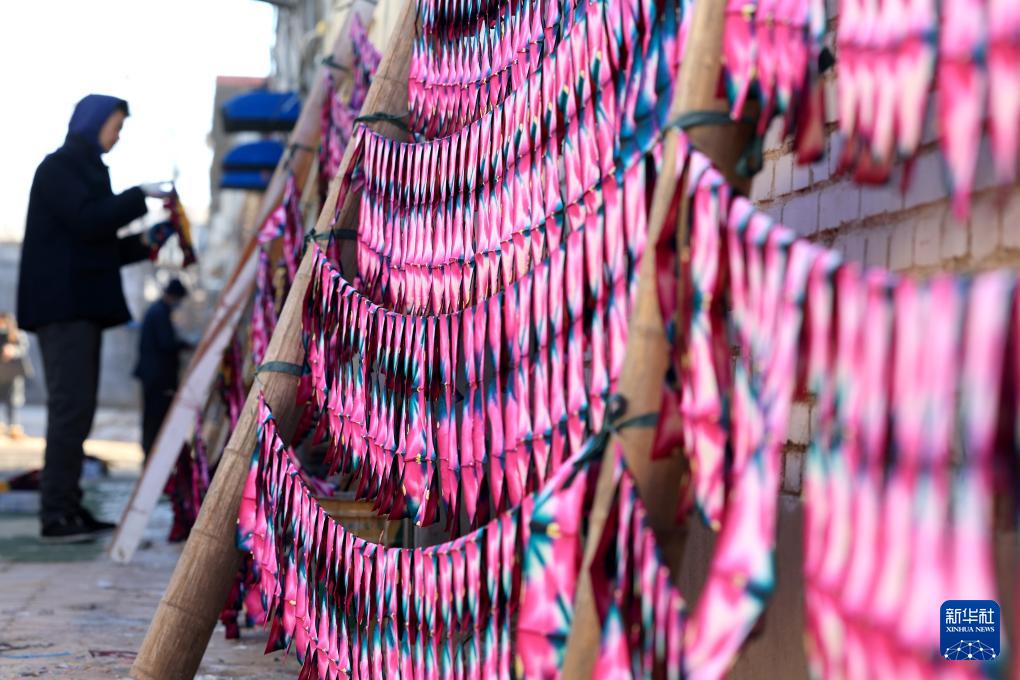 1月24日,在石家庄市栾城区邵家庄村,手工艺人在晾晒彩子。(新华社记者 牟宇 摄)