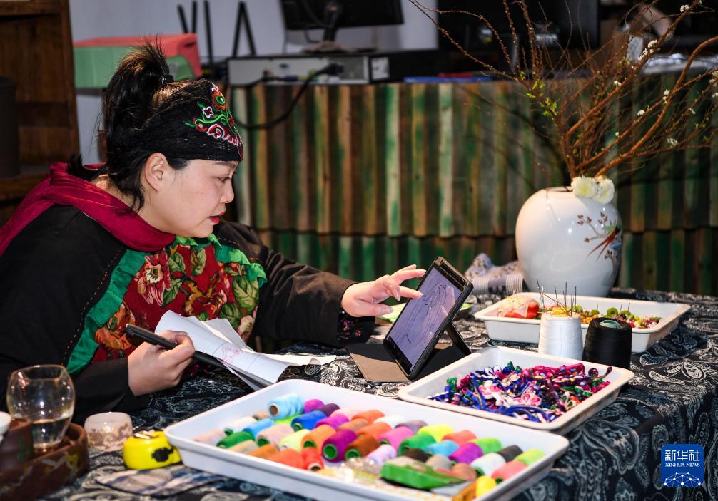 1月24日,杨秀燕在位于秀山县的金珠苗绣传承馆构思苗绣作品设计。(新华社记者 王全超 摄)