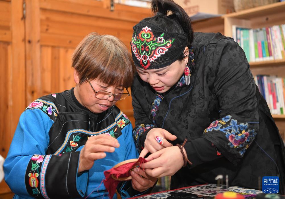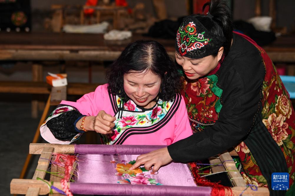 1月23日,在秀山县梅江镇民族村,杨秀燕(右)和绣娘交流刺绣技巧。(新华社记者 王全超 摄)