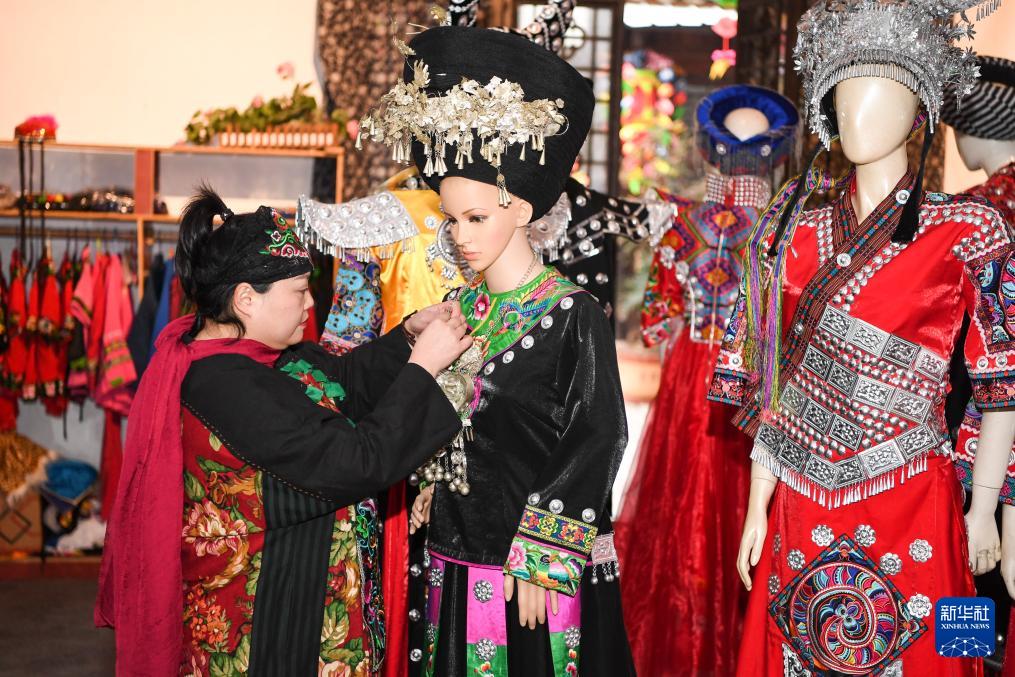 1月24日,杨秀燕在位于秀山县的金珠苗绣传承馆整理苗族服饰产品。(新华社记者 王全超 摄)