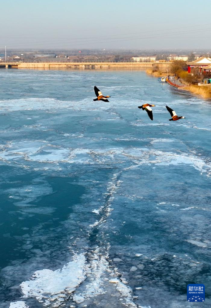 1月27日,在宁夏吴忠市,鸟儿在已经结冰封河的黄河上空飞翔(无人机照片)。(新华社发 袁宏彦 摄)