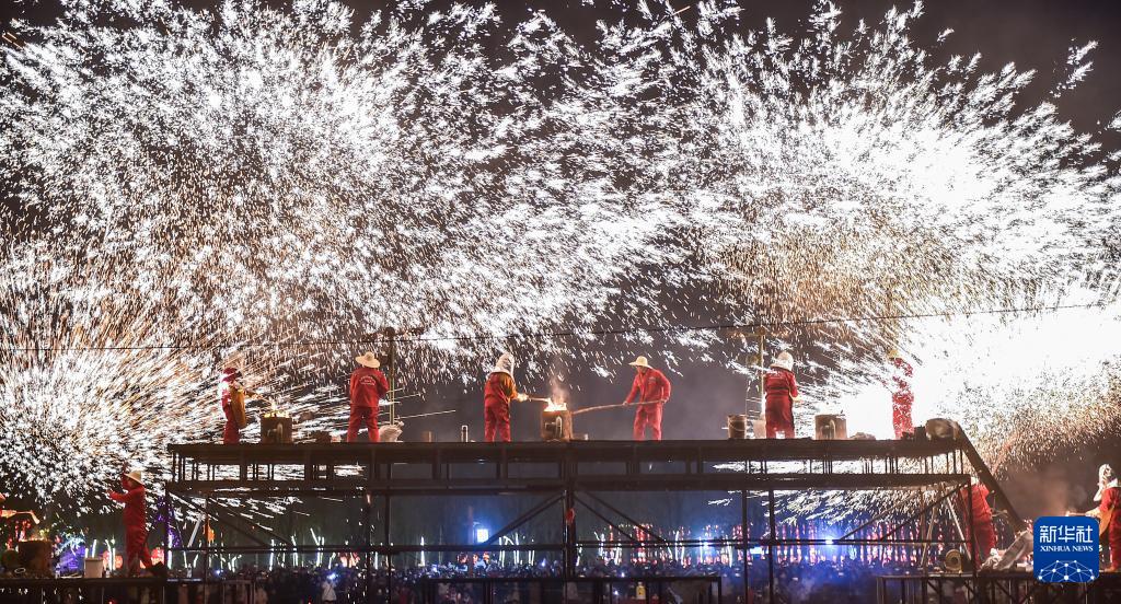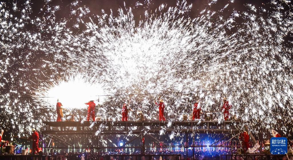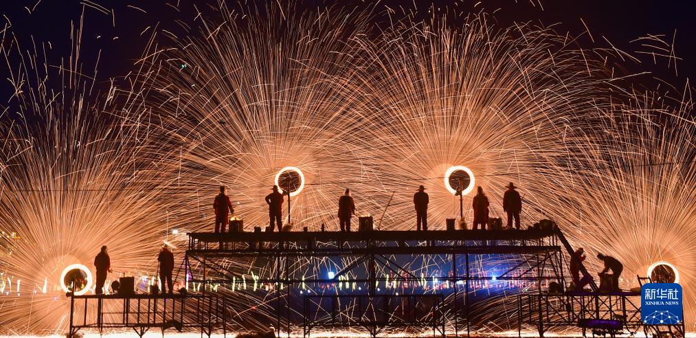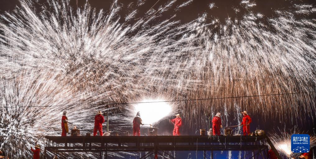 1月28日晚,民间艺人在洛阳2024隋唐河洛文化庙会上表演打铁花。(新华社发 黄政伟 摄)