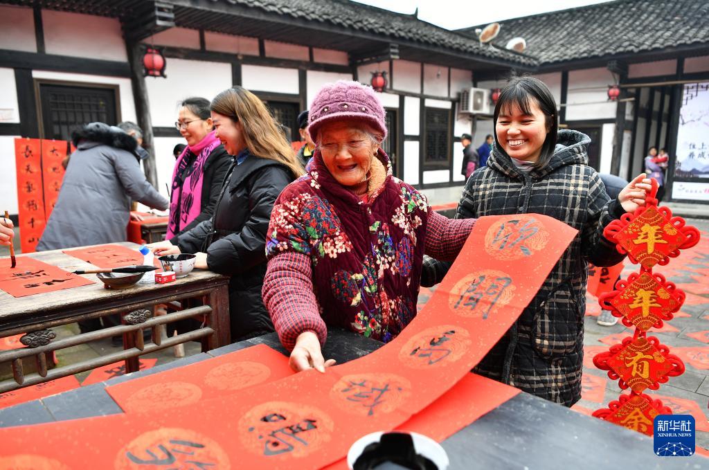 1月29日,四川省广安市邻水县袁市镇大光明社区的群众在“翰墨迎春”文化下乡活动现场领取春联。(新华社发 张启富 摄)