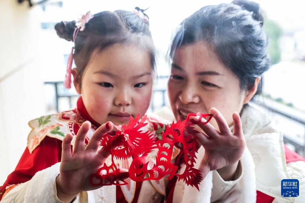 1月30日,浙江省湖州市长兴县李家巷镇中心幼儿园的孩子们欣赏剪好的窗花。(新华社记者 徐昱 摄)