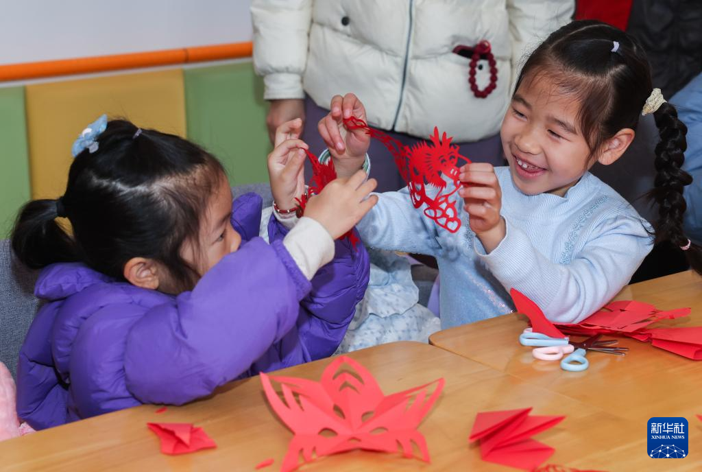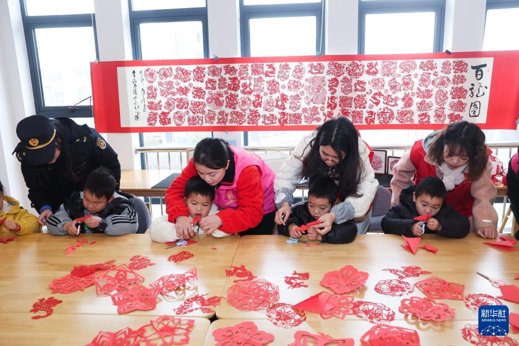 1月30日,浙江省湖州市长兴县李家巷镇中心幼儿园的老师和志愿者带着孩子们剪龙年新春窗花。(新华社记者 徐昱 摄)