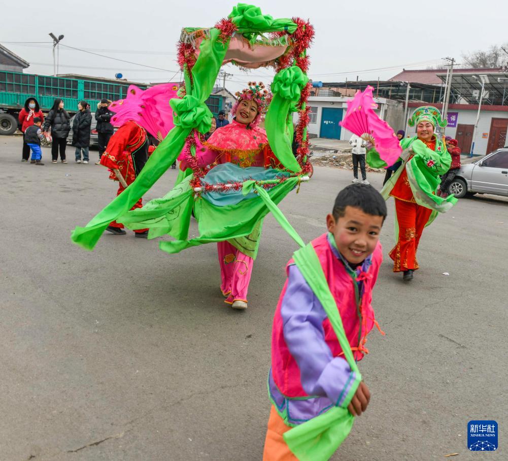 2月4日,河北省遵化市汤泉满族乡关山口村民间艺人在表演太平车民俗节目。(新华社发 李磊 摄)