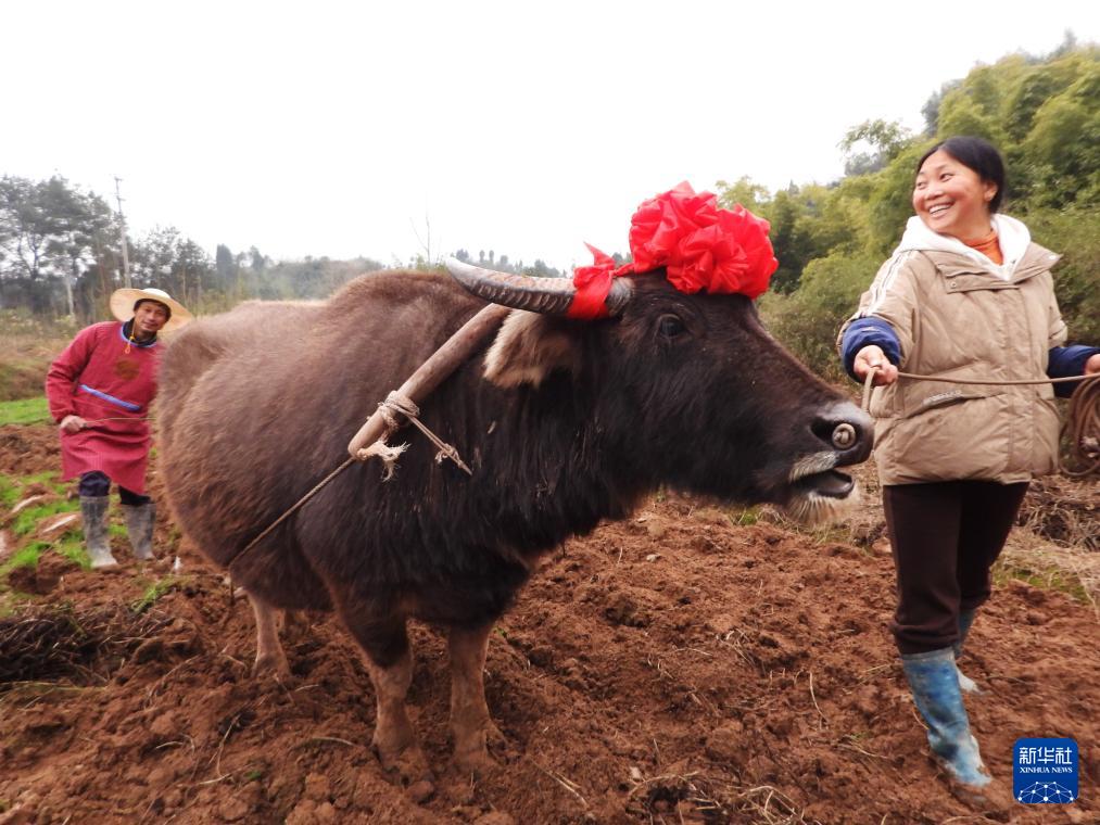 2月4日,四川省达州市大竹县竹阳街道农民在田间“犁春牛”,祈盼新的一年风调雨顺、五谷丰登。(新华社发 邓良奎 摄)