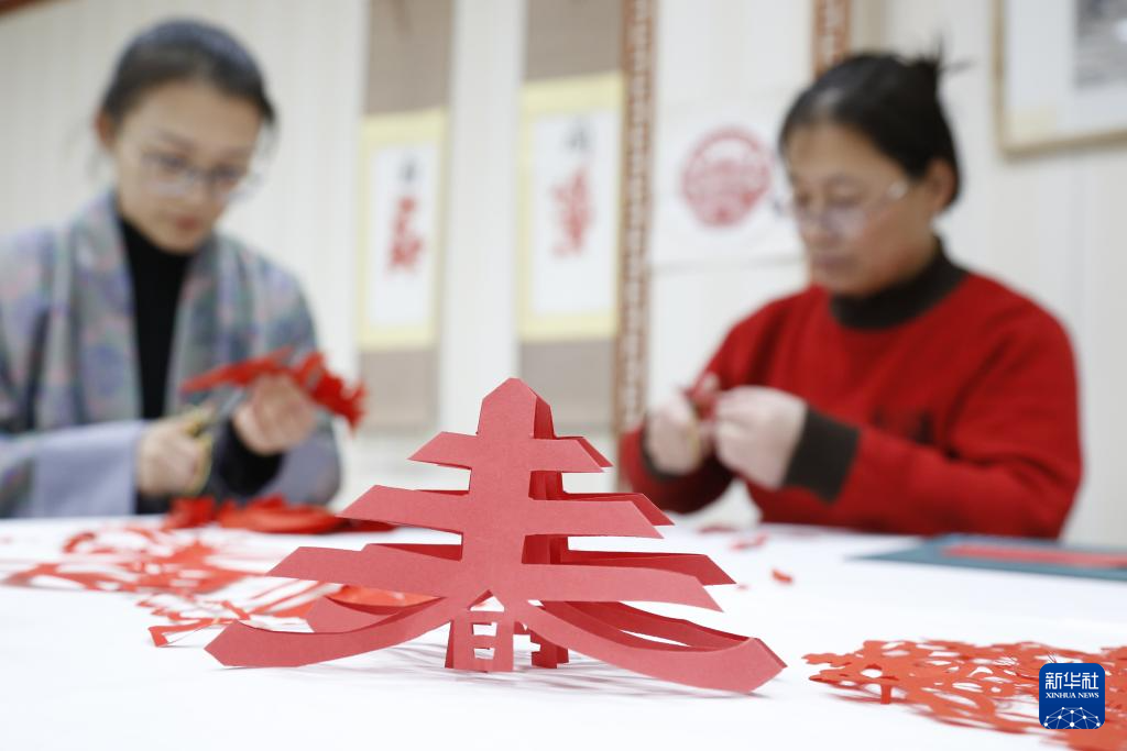 2月4日,剪纸爱好者在河北省邢台市广宗县图书馆剪纸迎立春。(新华社发 张驰 摄)