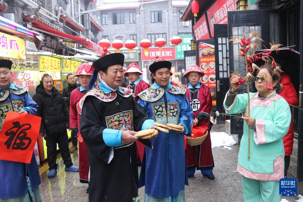 2月4日,在河南内乡县衙举办的“打春牛”系列民俗活动中,工作人员装扮的“县令”在向游客赠送春饼和春鸡。(新华社发 张中立 摄)