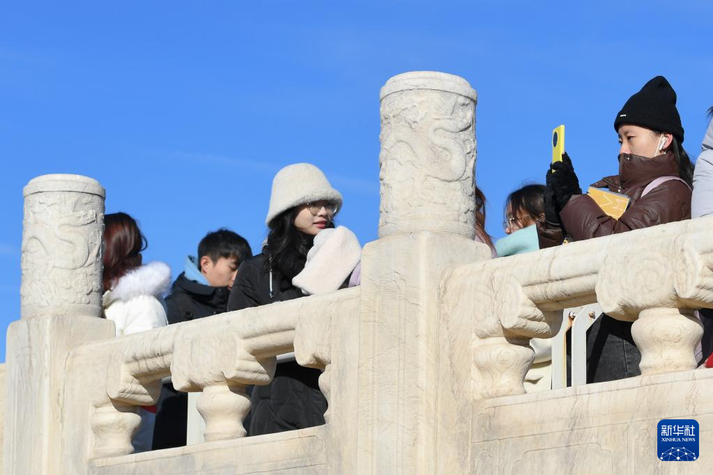 游客在天坛公园参观游览,天坛公园栏杆上雕刻有龙的形象(1月23日摄)。(新华社记者 鞠焕宗 摄)