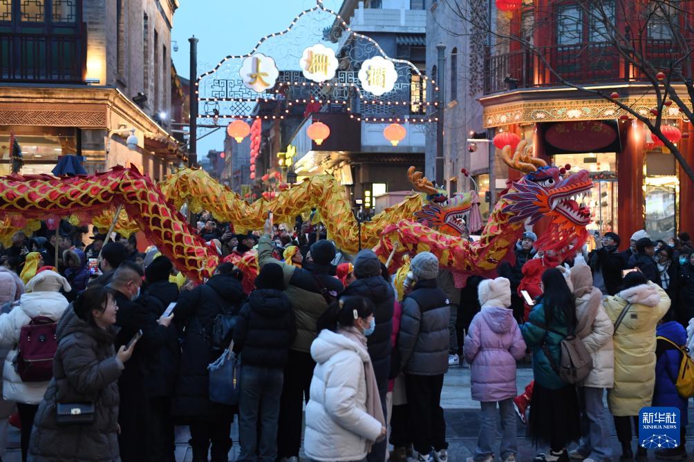 游客在前门大街观看舞龙表演(2月2日摄)。(新华社记者 鞠焕宗 摄)