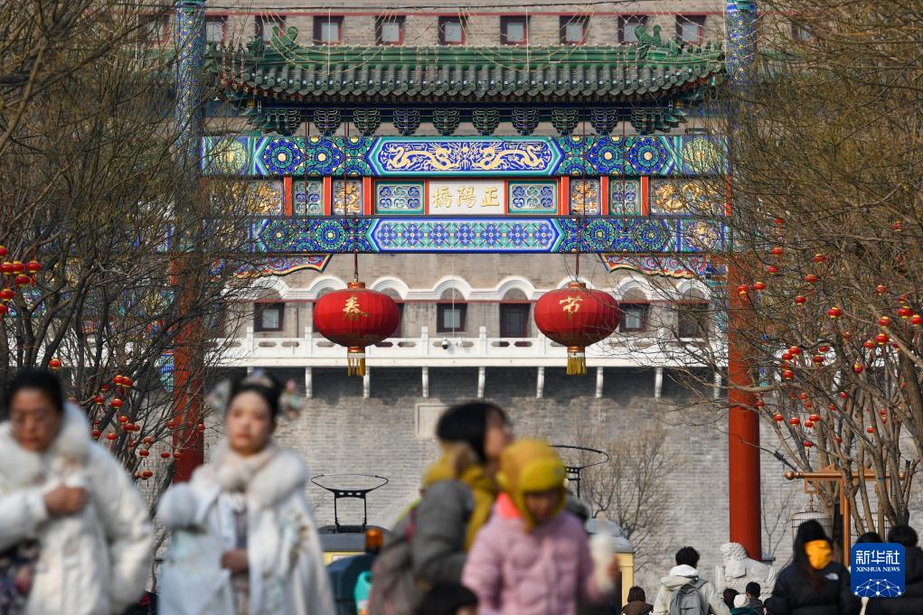 游客在前门大街参观游览,前门五牌楼上装饰有龙纹(2月5日摄)。(新华社记者 鞠焕宗 摄)