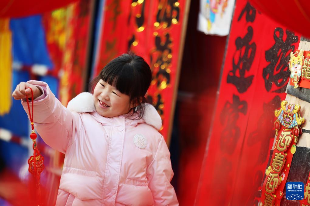 2月6日,一名小女孩在山东省郯城县一处年货销售点选购新春饰品。(新华社发 张春雷 摄)