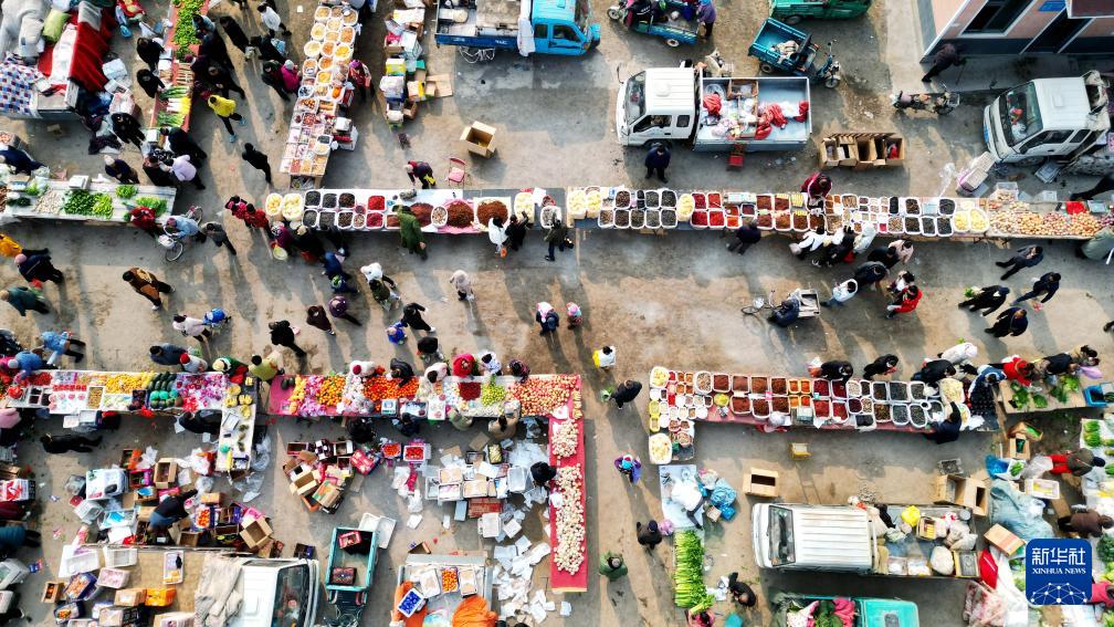 2月6日,村民在山东省东营市东营区牛庄镇牛庄村集市上置办年货(无人机照片)。(新华社发 刘智峰 摄)