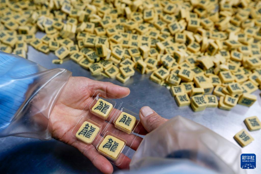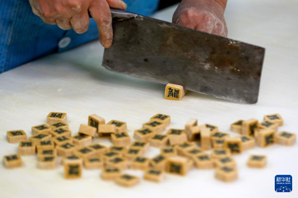 新春佳节将至,在安徽省黄山市祁门县,嵌字豆糖非遗传承人经过熬糖、磨粉、搅拌、压实、制字、拉伸、切片等手工工序制作嵌字豆糖。嵌字豆糖在切开的每块糖片中,都会蕴藏着一个吉祥如意的汉字,是一种可食可赏的特色糕点。