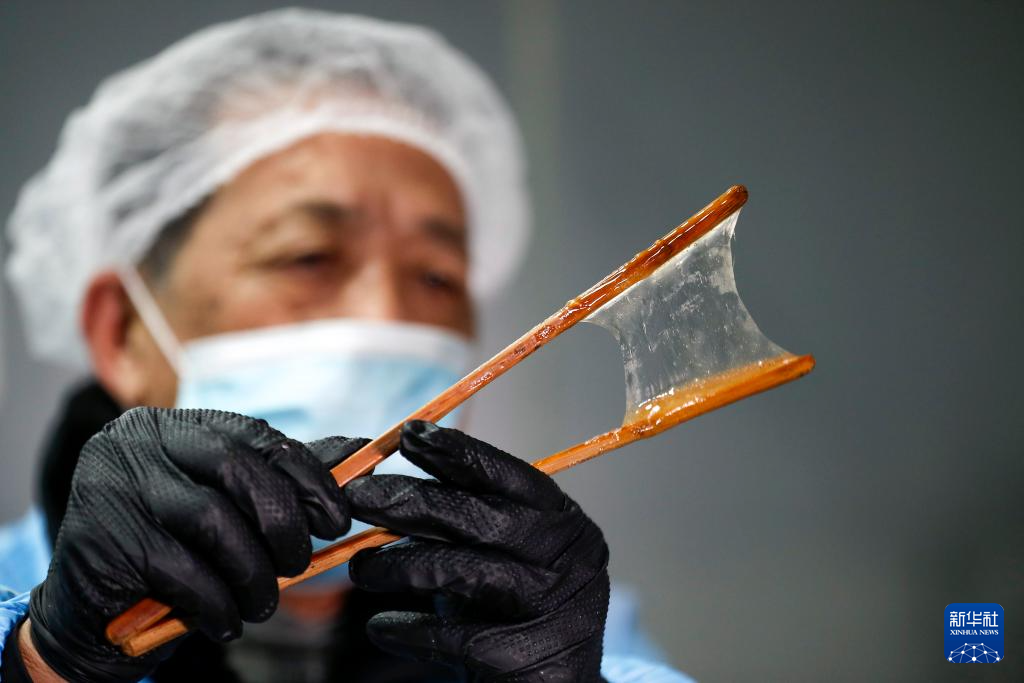 1月31日,非遗传承人金惠民在观察麦芽糖稀的粘稠度。(新华社发 施亚磊 摄)