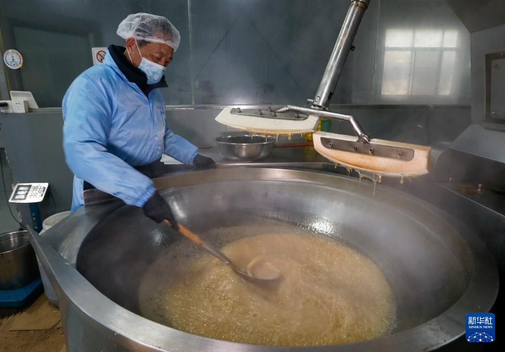 1月31日,非遗传承人金惠民在熬制麦芽糖浆。(新华社发 施亚磊 摄)