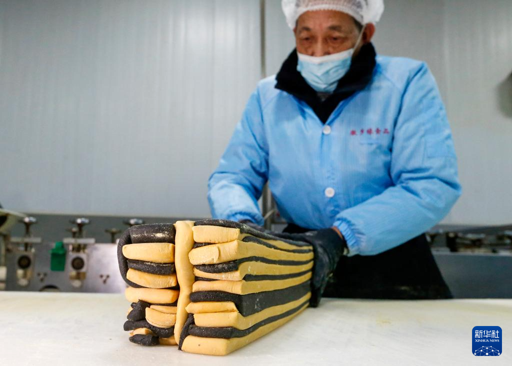 1月31日,非遗传承人金惠民在制作嵌字豆糖。(新华社发 施亚磊 摄)