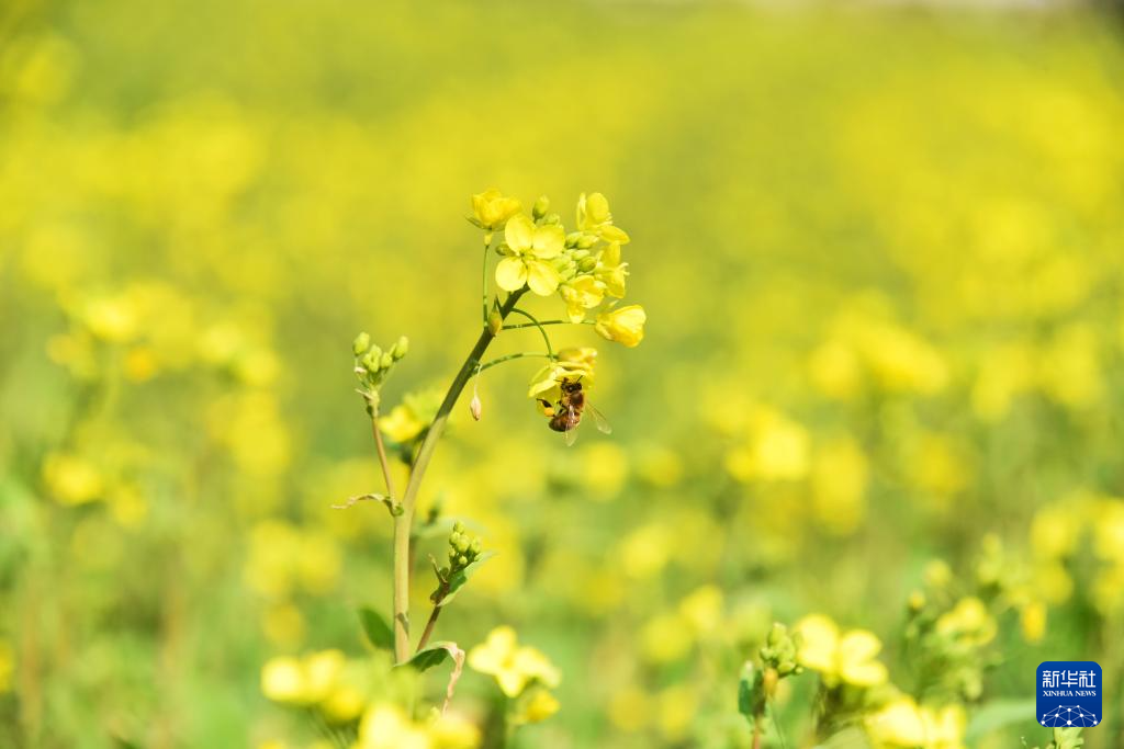 2月16日,在湖南省常德市澧县城头山镇,蜜蜂在油菜花田中飞舞。(新华社发 柏依朴 摄)