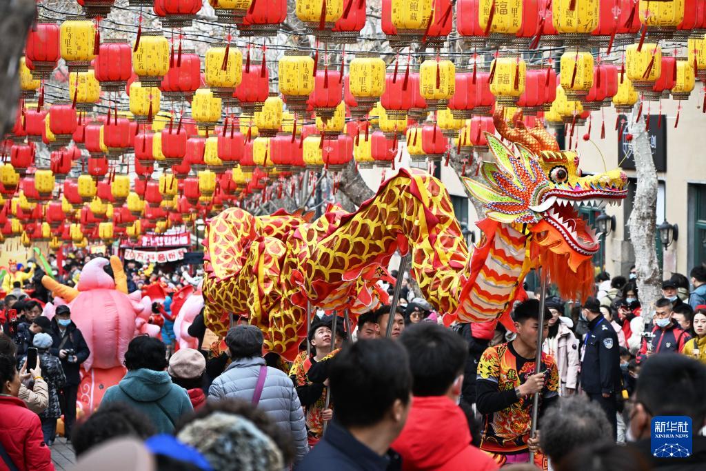 2月18日,游客在萝卜·元宵·糖球会上观看舞龙表演。(新华社记者 李紫恒 摄)