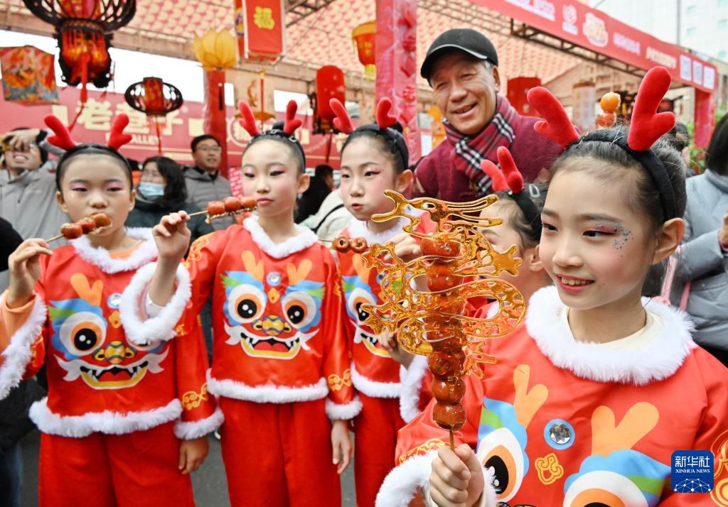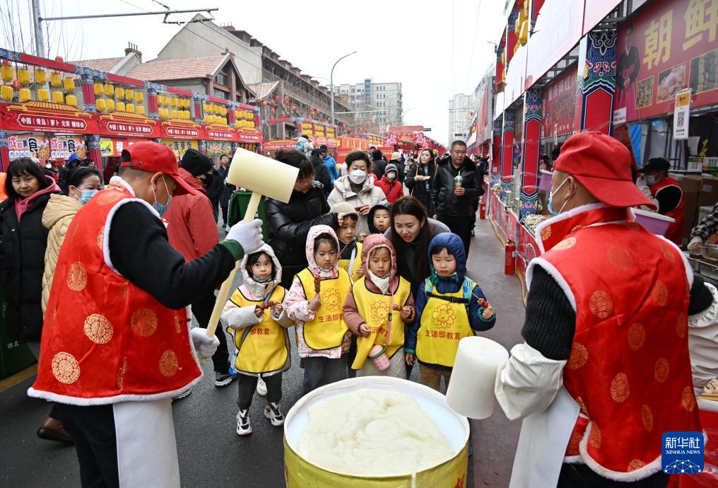 2月18日,小演员在萝卜·元宵·糖球会上品尝糖球。(新华社记者 李紫恒 摄)