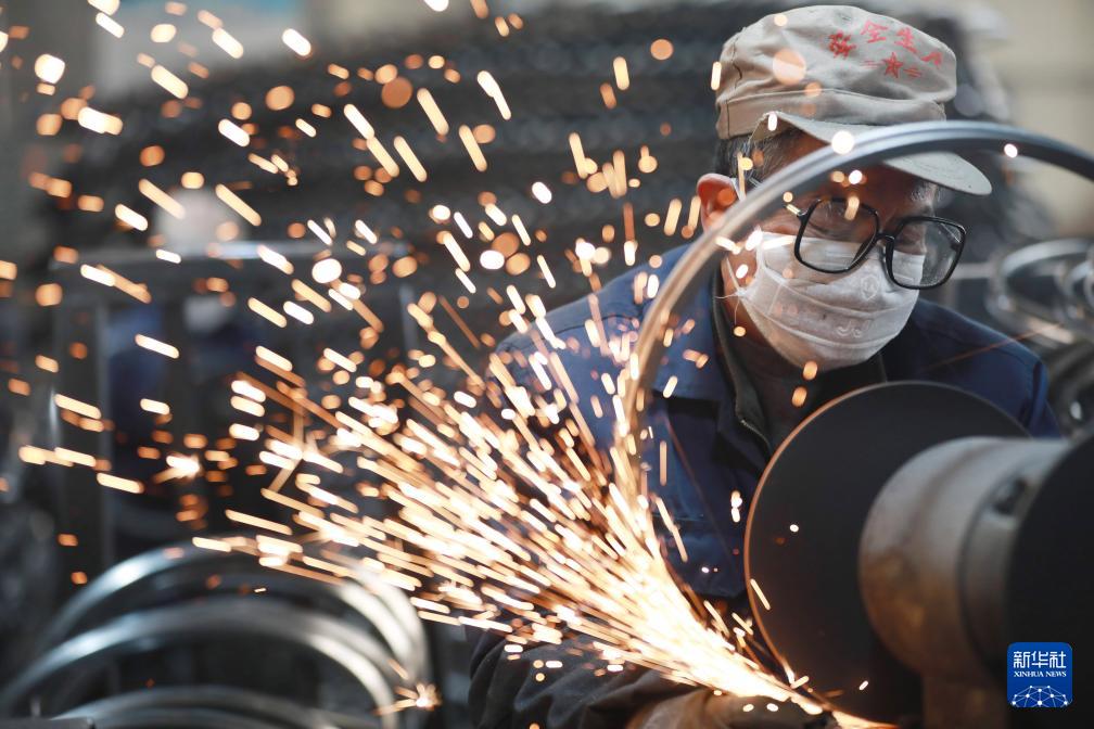 2月18日,在浙江省杭州市临安区天目山镇一家外贸企业,工人对自行车钢圈进行抛光。(新华社发 胡剑欢 摄)