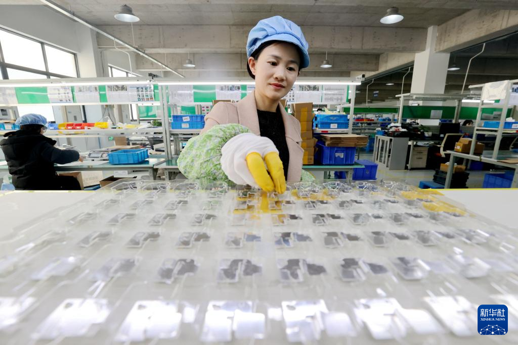 2月18日,在浙江省湖州市德清县禹越镇一家精密部件生产企业,工人在赶制新能源汽车电池配件产品。(新华社发 谢尚国 摄)