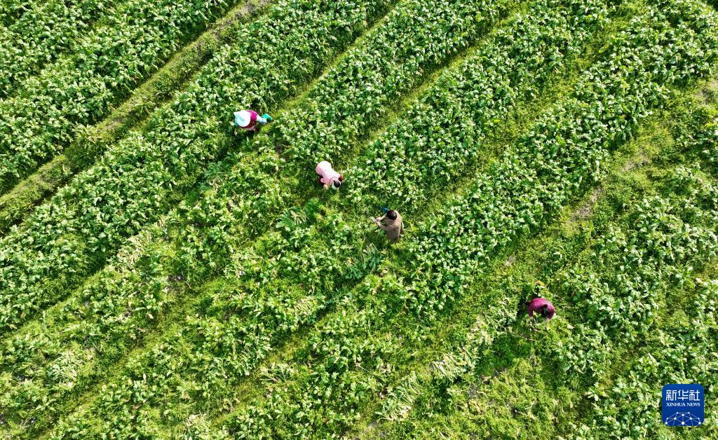 2月18日,湖南省通道侗族自治县万佛山镇坪地村村民在田里采收大头菜(无人机照片)。(新华社发 粟勇主 摄)