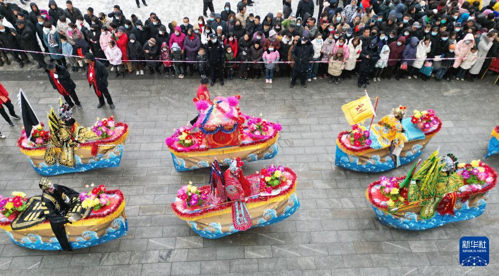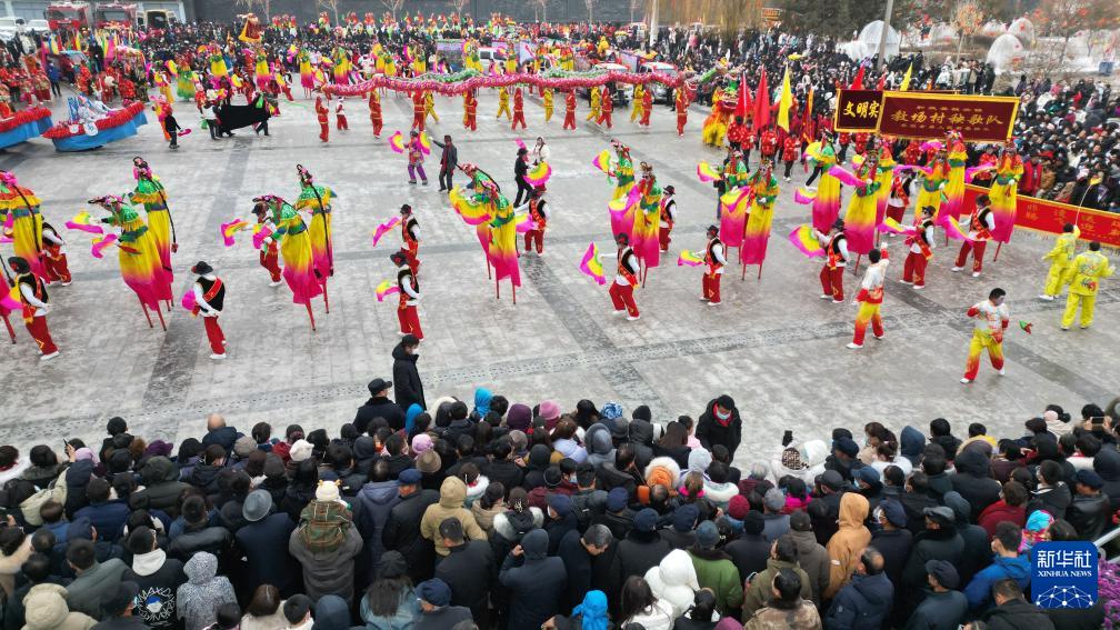 2月22日,秧歌队员在甘肃省和政县聚兴广场表演秧歌(无人机照片)。(新华社发 史有东 摄)
