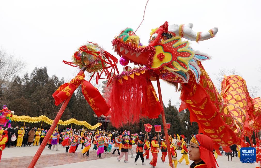 2月22日,社火队员在甘肃省定西市安定区市民公园表演舞龙。(新华社发 王克贤 摄)