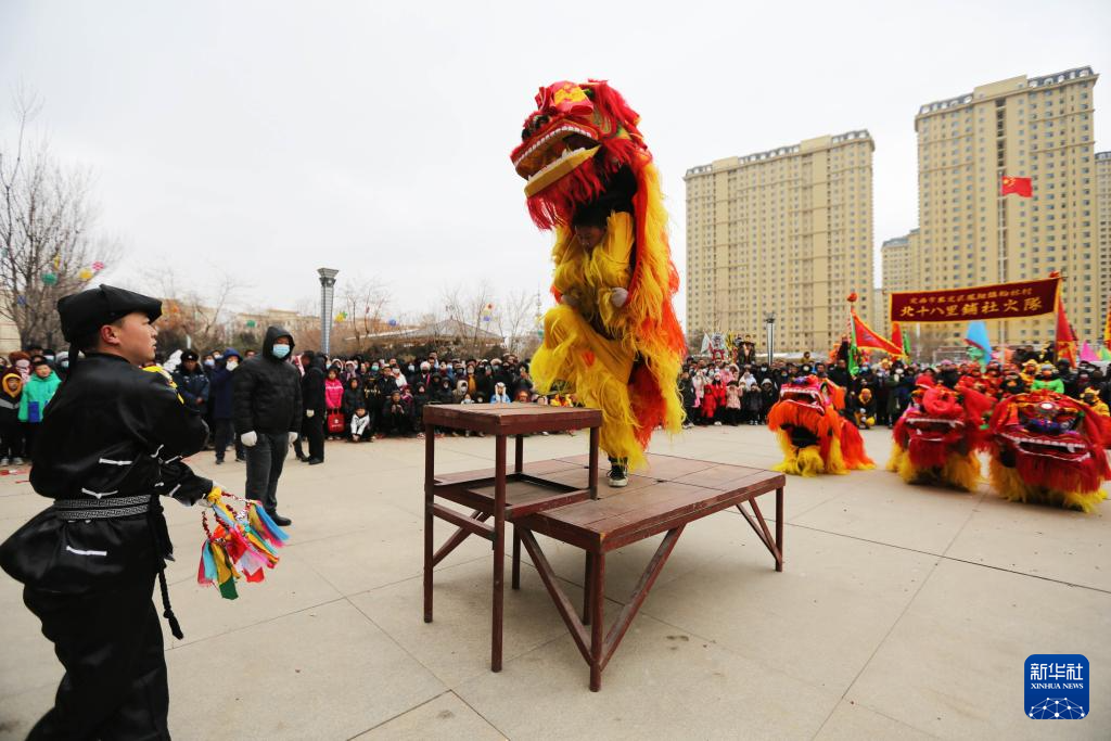 2月22日,社火队在甘肃省定西市安定区市民公园表演舞狮。(新华社发 王克贤 摄)
