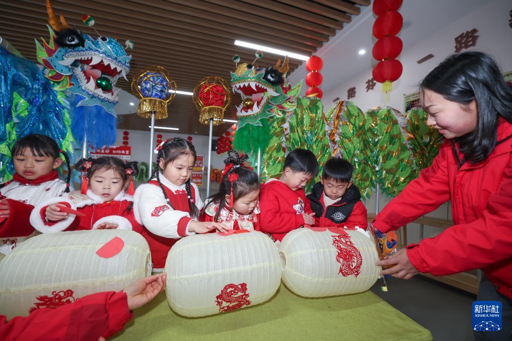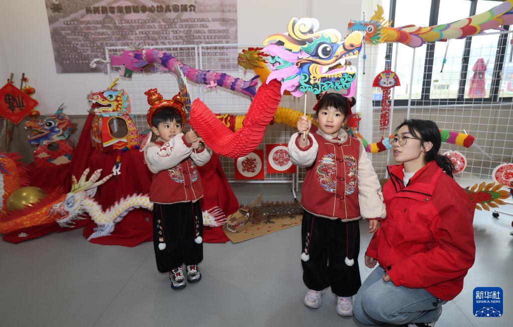 2月25日,浙江省湖州市长兴县李家巷镇中心幼儿园开展“趣探非遗 喜迎开学”开学第一课主题活动。孩子们在老师的带领下,学习与龙年相关的中国传统文化知识,体验舞龙、剪纸、做灯笼,近距离感受非遗传统文化的独特魅力。