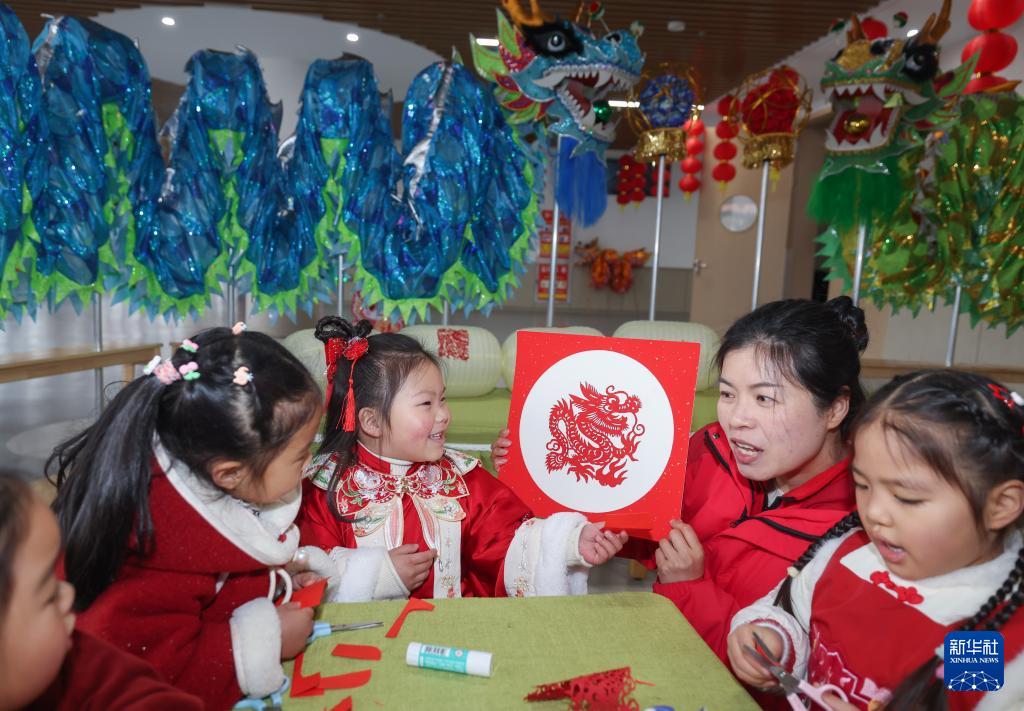 2月25日,李家巷镇中心幼儿园的老师给孩子们展示龙年主题剪纸。(新华社记者 徐昱 摄)
